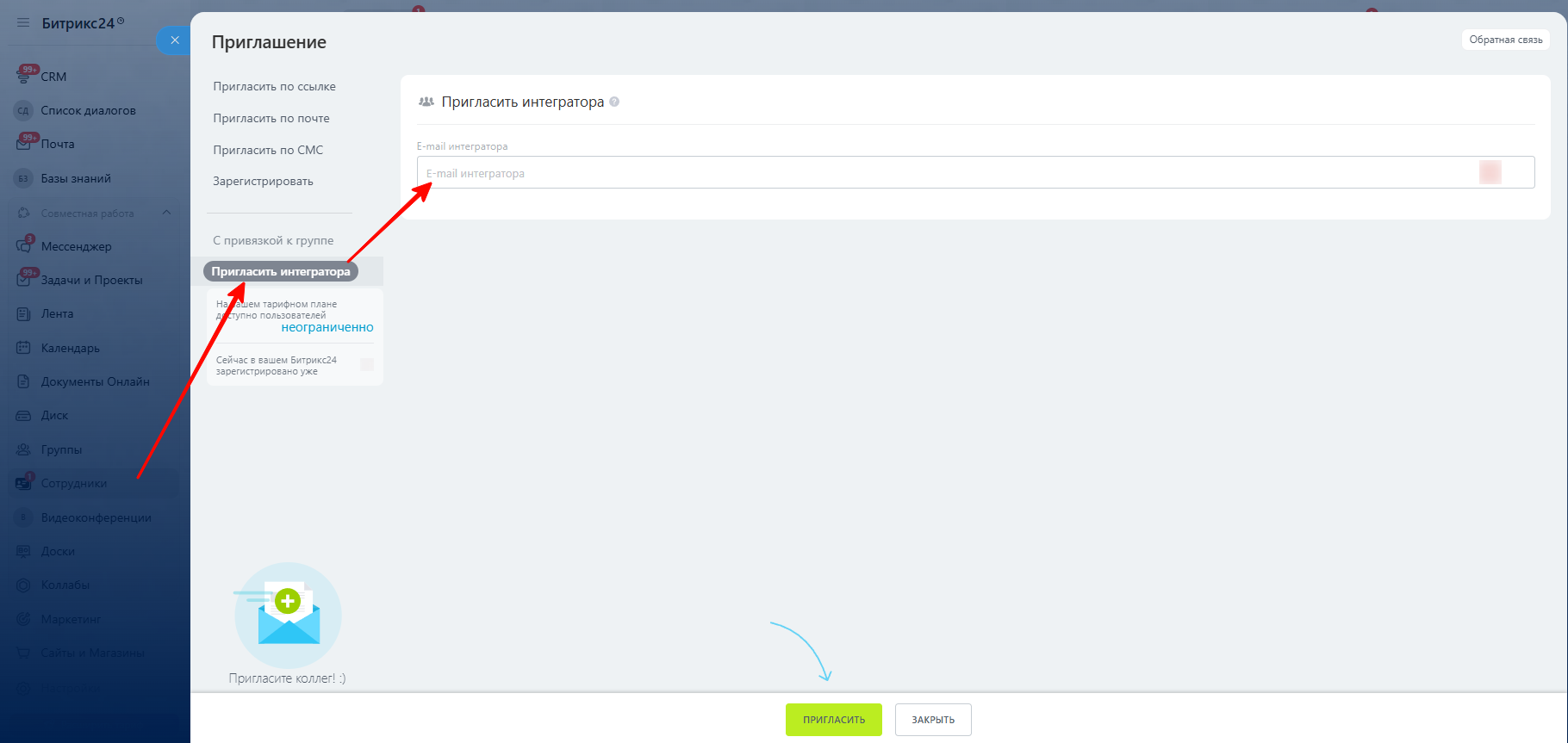 2. В списочном меню выбираем раздел "Пригласить интегратора" и в поле "E-mail интегратора" вводим email: