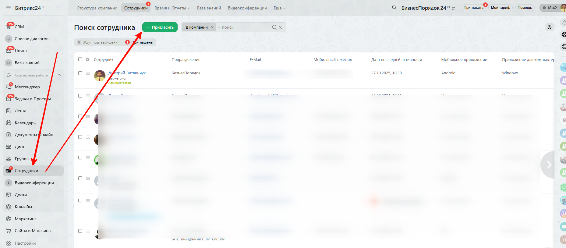 1. В левом меню выбираем блок "Компания" и кликаем на кнопку "Пригласить сотрудников":